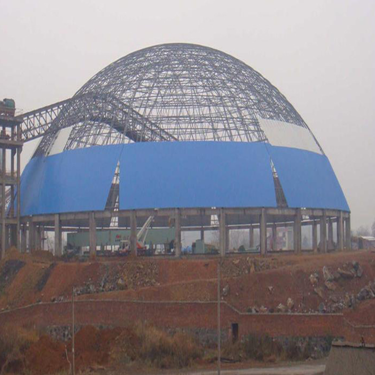球形污泥池料場全封閉網架采用正放四角錐形式,采用螺栓球接點,采用普通鋼管材,采用兩側焊接水平支座。