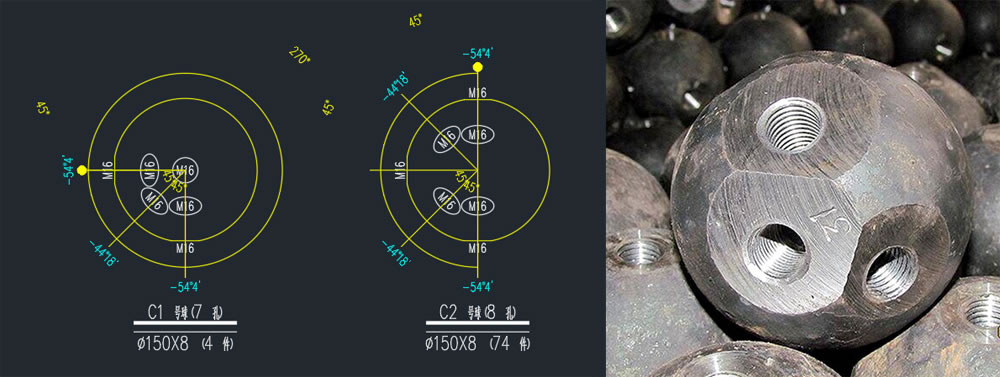 1.鋼管與錐頭(或封板)采用E43焊條焊接,焊縫要求飽滿,不得有夾渣、氣孔、咬肉、未焊透等缺陷。鋼板與球焊接時,球應(yīng)預(yù)熱150~200?o?C,方可施焊。